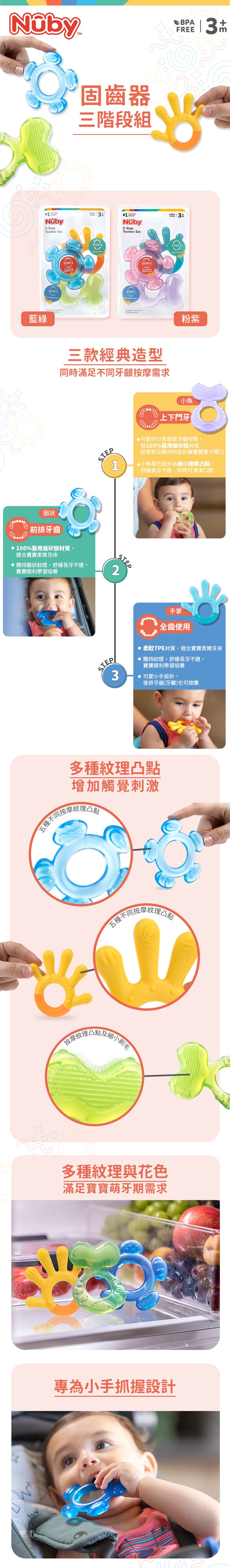 - 柔軟細顆粒的前端細緻紋理,適合剛開始長出門牙的寶寶