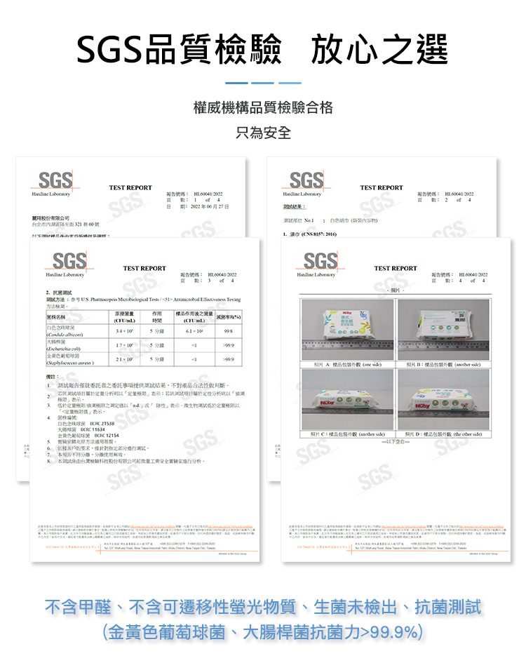 <產品特色> 天然木漿植物纖維,可沖馬桶 99.9有效抑菌 (經台灣SGS測試大腸桿菌、金黃色葡萄球菌 抗菌力>99.9%、白色念珠菌抗菌力99.8%) 洋甘菊、積雪草、蘆薈萃取物添加,植粹呵護 舒爽、速乾、不黏膩 萌趣卡通壓花 溫和配方:不含酒精、無色素、無香精、無螢光劑、無paraben 通過SGS生菌數/大腸桿菌檢驗零檢出 SGS檢驗報告