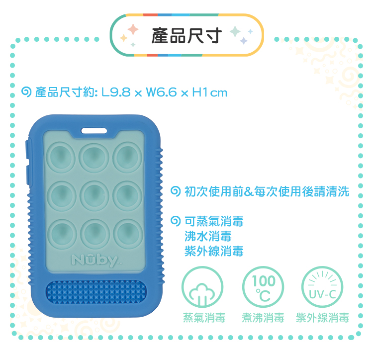 - 每個按鍵都有不同紋理凸點,溫柔按摩寶寶幼嫩牙齦